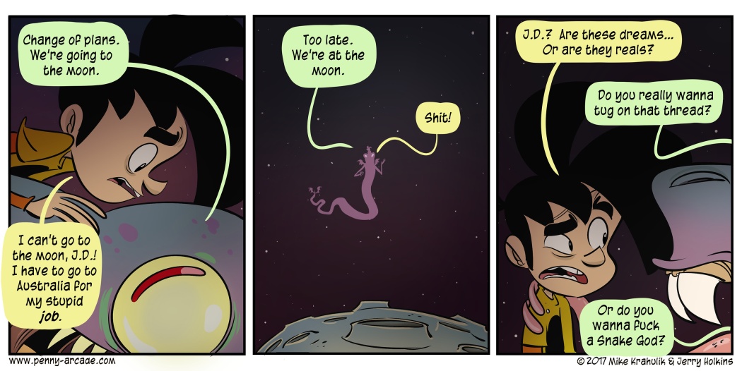 Understand that I have started it many times. I know virtually everything about it. I also know that when I look at the screen in Google Docs my mind is as blank and featureless as the page I see there. When it comes to the strip, or the post, I have very set times these things need to be done, and I always do them. I didn't have a way to cross apply that to a longer form piece, not really - not in a way that had teeth. But apparently a vow in front of a couple thousand people had the correct PSI or whatever. Writing it was hard until it wasn't. I really want to thank that guy, because if you get a book out of this, it's on him. I hope he likes it.